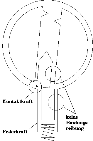 Bild 5.2 zeigt eine Einzel-Stift-Position, nachdem ein Drehmoment auf den Schloßkern angewendet worden ist. Die Kräfte, die auf den Kernstift wirken, entstehen durch Reibung von den Seiten; die Feder erzeugt Kraft von oben und die Kontakt-Kraft vom Kernstift entsteht unten. Der Betrag des Druckes, den Sie auf das Öffnungswerkzeug anwenden, bestimmt die Kontakt-Kraft von unten.