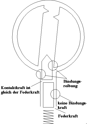 Wenn die Unterkante des Gehäusestiftes die Scherlinie erreicht, ändert sich die Situation plötzlich . Sehen Sie Bild 5.3. Die Reibung der Bindungskraft geht gegen Null und der Schloßkern rotiert geringfügig (bis einige andere Stifte klemmen). Jetzt ist der einzige Widerstand gegen eine Bewegung die Federkraft. Nachdem die Oberkante des Kernstiftes die Lücke zwischen dem Schloßkern und dem Schloßgehäuse überquert, entsteht eine neue Kontakt-Kraft und der Kernstift gelangt im Schloßgehäuse an. Diese Kraft kann ganz groß werden, und erreicht ihre Spitze in der Höhe des Druckes, der gebraucht wird, um den Stift zu bewegen .