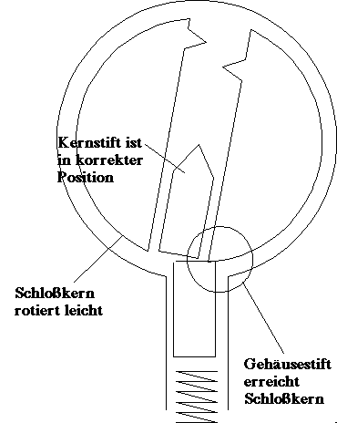 Die langsame Grund-Öffnungs-Technik (Kapitel 4) ertastet die Stifte, die am meisten klemmen. Das Kraftdiagramm (Bild 5.5), entwickelt in Kapitel 5, schlägt einen schnelleren Weg vor, die richtigen Stifte auszuwählen und zu heben. Nehmen Sie an, daß alle Stifte durch das gleiche Kraftdiagramm charakterisiert werden könnten. Es kann sein, das alle Stifte klemmen und daß sie alle auf die gleiche Reibung treffen. Betrachten Sie jetzt den Effekt, wenn das Öffnungswerkzeug mit einem Druck über alle Stifte läuft, der groß genug ist, die Federkraft zu überwinden und die Reibungskräfte aber nicht groß genug sind, daß die Anstoßkraft der Kernstifte sie nicht in das Schloßgehäuse drückt. Jeder Druck, der sich über dem flachen Teil des Kraftdiagrammes befindet und jeder der unter dem oberen Punkt der Spitze ist, wird funktionieren. Wenn das Öffnungswerkzeug über einen Stift läuft, wird der Stift sich bewegen wenn er das Schloßgehäuse trifft, aber er wird nicht in das Schloßgehäuse eintreten. Sehen Sie Bild 5.3. Die Zusammenstoß-Kraft an der Scherlinie widersteht dem Druck vom Öffnungswerkzeug; so fährt das Öffnungswerkzeug über die Stifte, ohne sie in das Schloßgehäuse zu drücken. Falls das richtige Drehmoment angewendet wird, wird der Schloßkern geringfügig rotieren. Wenn das Öffnungswerkzeug den Stift verläßt, wird der Kernstift zurück in seine anfängliche Position fallen, aber der Gehäusestift wird am Rand des Schloßkerns eine Barriere finden und über der Scherlinie aufgehalten. Sehen Sie dazu Bild 6.1. In dieser Theorie verursacht der Strich des Öffnungswerkzeuges über die Stifte die Öffnung des Schlosses.